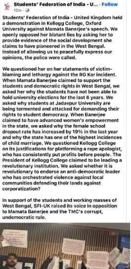 যদিও এসএফআই, ইউকে-র তরফে লিখিত বিবৃতি জারি করে বলা হয়েছে অন্য কথা। তাঁদের দাবি, বাংলার একাধিক ইস্যু নিয়ে মুখ্যমন্ত্রীর কাছে জানতে চাইছিলেন ওই সদস্যরা। কেন ছাত্রভোট হচ্ছে না, আর জি করের ঘটনায় কী পদক্ষেপ নিয়েছে রাজ্য সরকার, বাংলায় লগ্নি হচ্ছে, তার প্রমাণ কোথায়? এসব প্রশ্ন করা হচ্ছিল। শান্তিপূর্ণভাবেই তাঁদের কথা শোনা যেত। তা না করে পুলিশ ডাকা হল এবং অযথা অশান্তি হল। অর্থাৎ মমতা বন্দ্যোপাধ্যায়ের বক্তৃতার মাঝে এই অযাচিত পরিস্থিতির জন্য তাঁরা উলটে অক্সফোর্ড কর্তৃপক্ষকেই দায়ী করল।